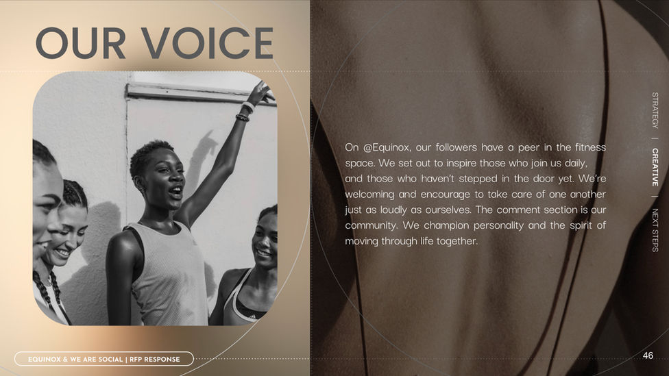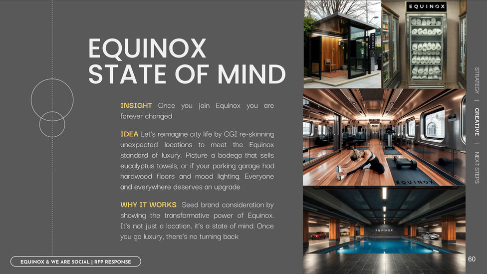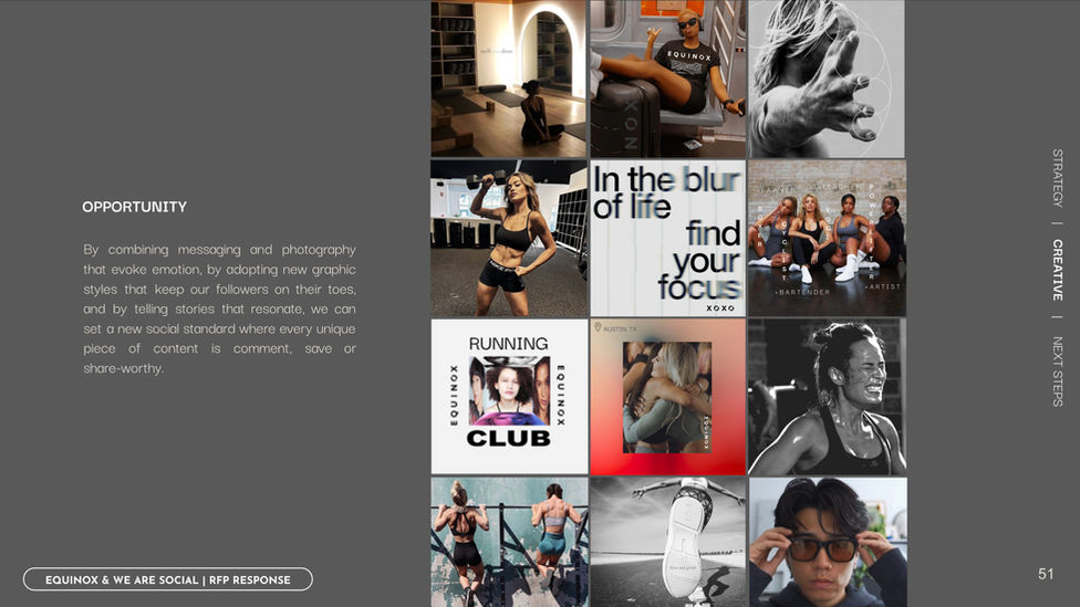 My background in both fitness and luxury came into play for this pitch. I’m proud of how the visuals evolved—as a team we pushed the work both aesthetically and conceptually. I introduced the line “Less Bodies, More Human” after noticing a lack of authentic imperfection and personality in the feed. Our recommendation was to reveal the deeper layers of the brand, much like an x-ray or infrared scan, which became the inspiration for the visual identity. We ideated several content series and partnerships, including interviews, BTS with trainers using Meta glasses, and home décor crossovers designed to bring the feeling of Equinox into your everyday. The goal was to create a world you could almost feel—intimate, intentional, and human.