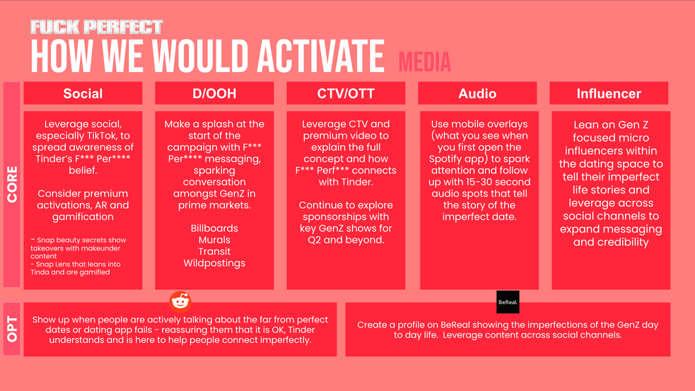 This one was a ride. I’d never used a dating app, so it was uncharted territory—but as a storyteller (and part-time modern anthropologist), I tapped into the mindset of the platform and its users. Our team went big, presenting three distinct creative directions: one bold, one familiar, and one unapologetically spicy. We didn’t win the pitch, but I was proud of the work—the messaging, the visuals, and the world we built around each territory all (in my opinion) hit the mark.